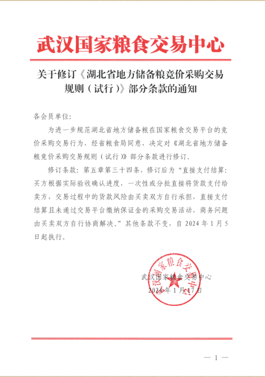 关于修订《湖北省地方储备粮竞价采购交易规则(试行)》部分条款的通知